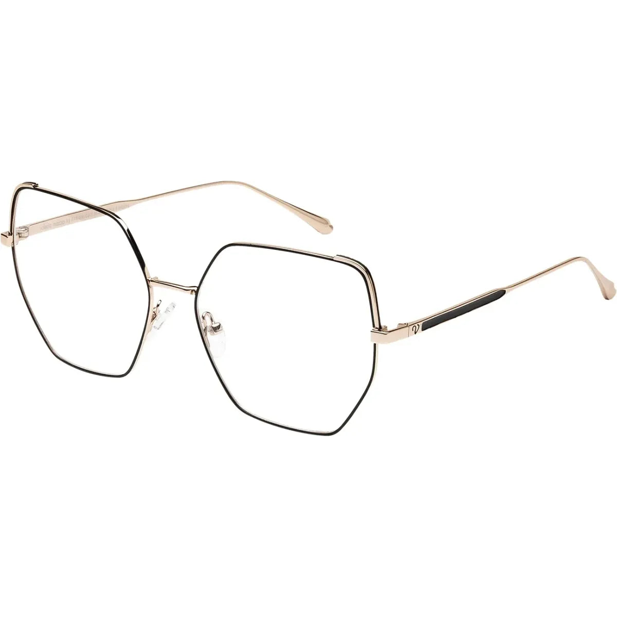 Armazón de diseño elegante con estructura metálica color oro y detalles en negro. Logo VALERIA MAZZA aplicado en las patillas, que aporta sofisticación y refuerza el estilo femenino y refinado característico de la marca.