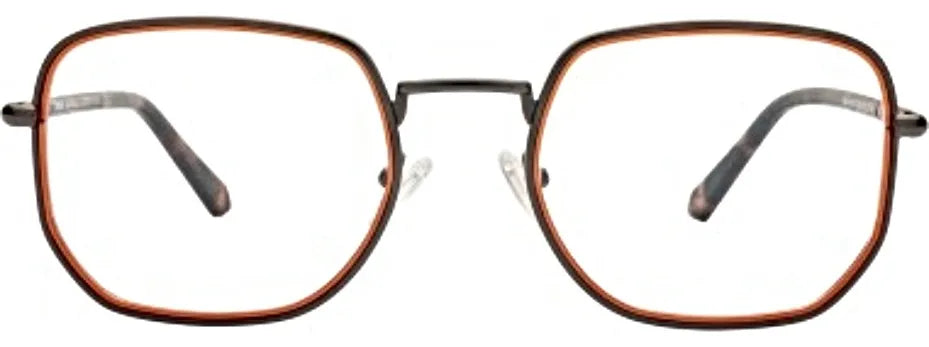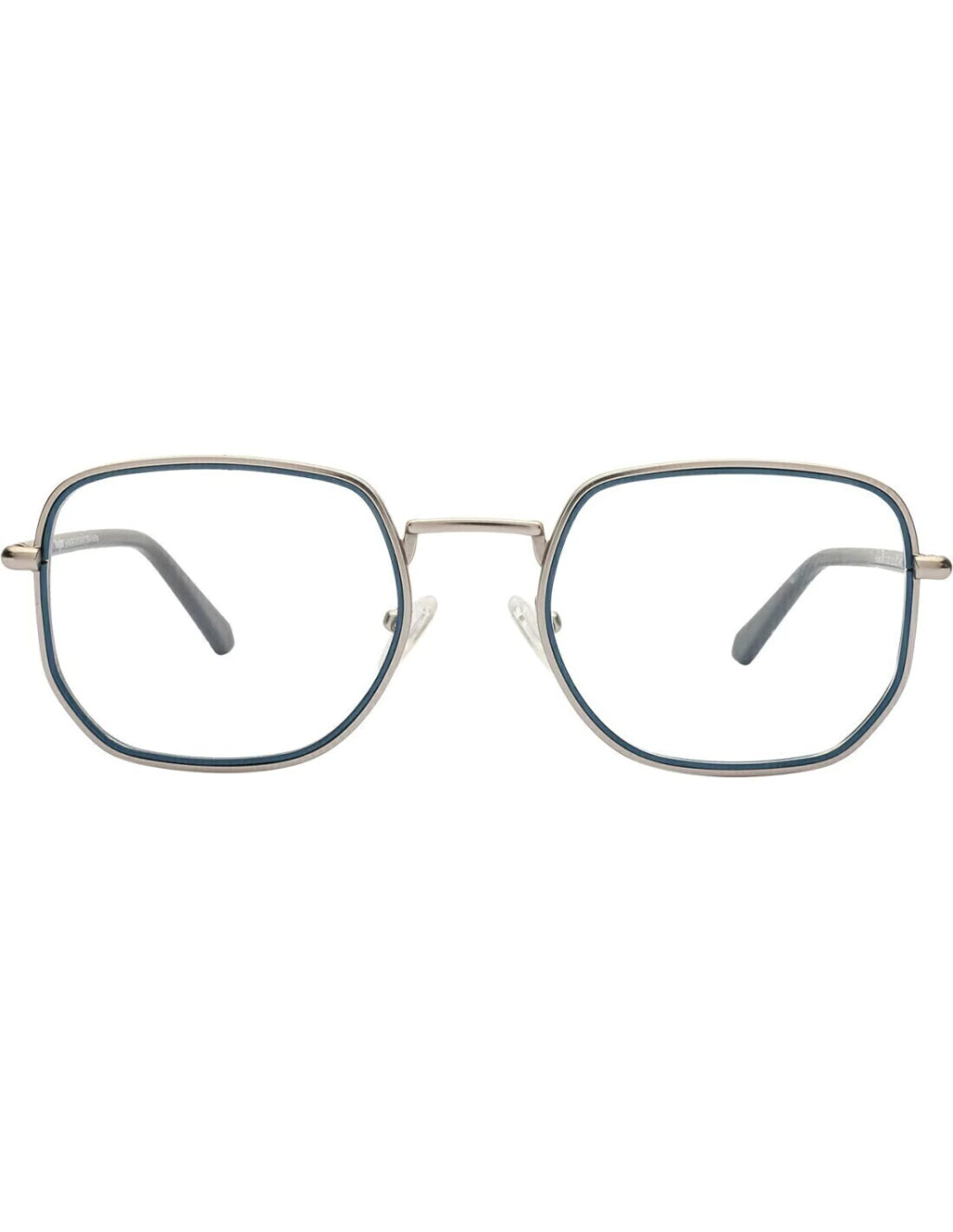 Armazón de diseño rectangular con estructura metálica en níquel blanco y detalles en azul, con patillas en níquel blanco. Logo WRANGLER aplicado en las patillas, que refuerza una estética moderna y el carácter auténtico de la marca.